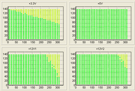 Below are the results for automatic measurement of the cross-load characteristics. The principle of load adjustment is this: with the permanent current in 3.3V and 5V lines, the load current of 12V lines is varied within 0V to a specified maximum, then the current of 3.3V and 5V lines is raised by a specified value, and the process recurs. In our case, the raise for 3.3V and 5V lines was set at two points, in ten points increments for 12V lines. The adjustment is performed at a set increment, which in our case is 200 ms.