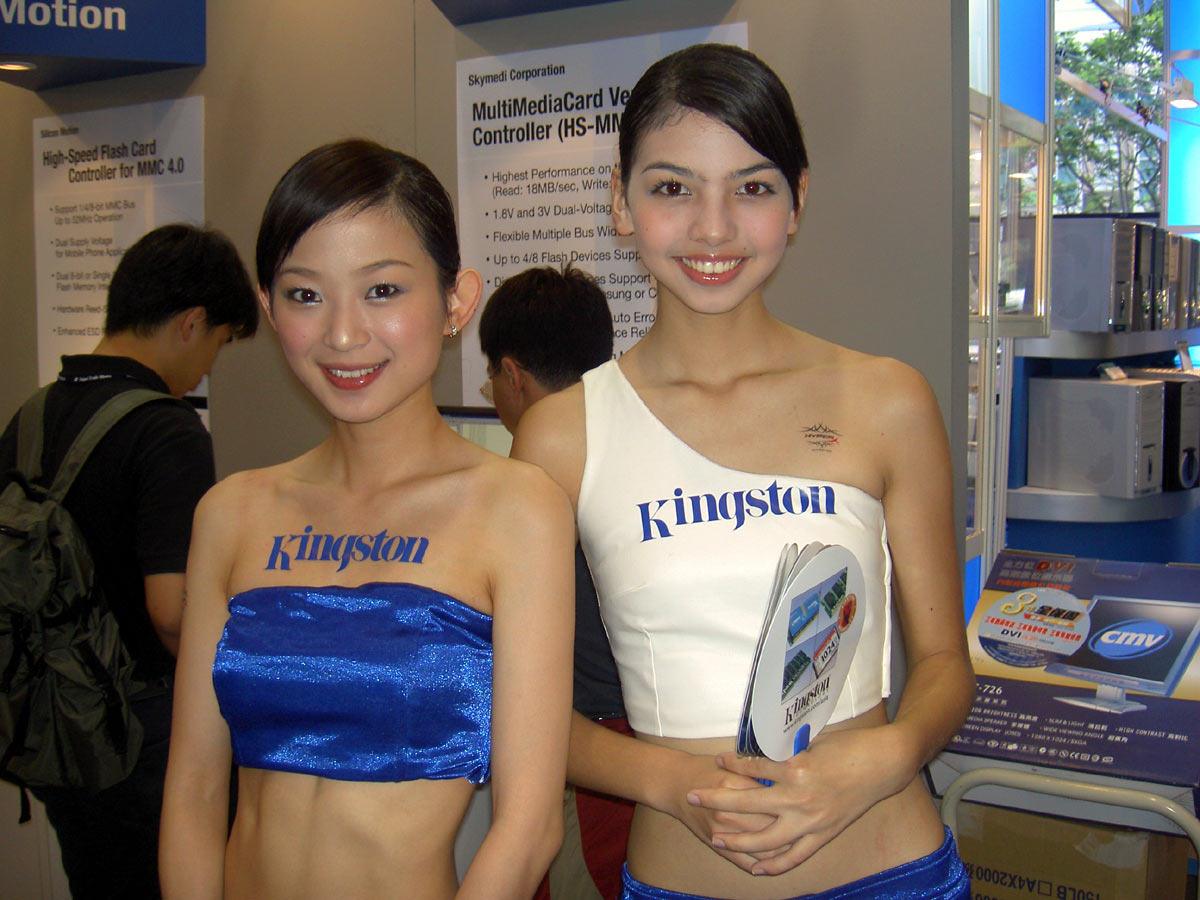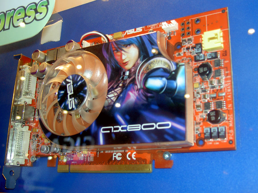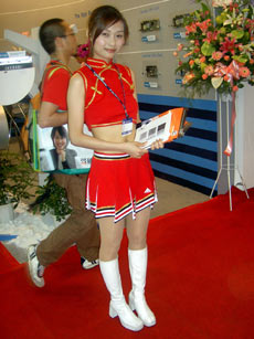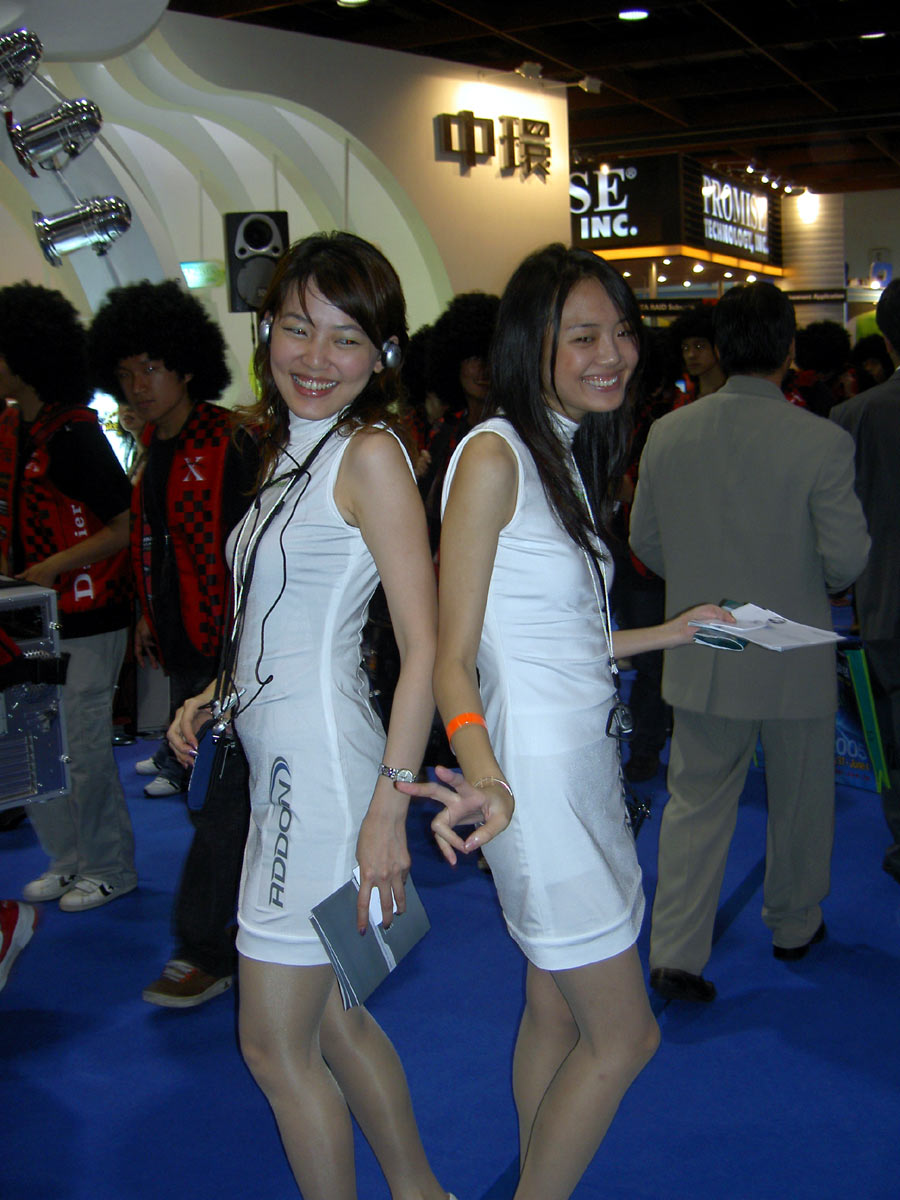 The right-hand, non-ultra version, is already the company's own. Like at ASUS's expo stand, there was no interim GT version, although both companies promised to produce it. The GT is 16 pipelines albeit with reduced clock speeds of the core and memory (350/1000Mhz). Doesn't make sense dumping the chips whose all the 16 pipelines were operative albeit did not reach the intended frequencies... But all this is simply exotics to demonstrate the technological advancements of the industry. For common people, there are different, quite fresh lines of PCI-Ex video cards: To be more precise, they were "fresh" still at CeBit 2004 - who knew that Intel would delay the launch of Grantsdale for so long... The frequencies of these cards are absolutely standard - after all, these are full analogs of their AGP brothers with the PCI-Ex bridge added. That is, even in theory the use of PCI-Ex cards won't give any boost. The purpose of their release is to provide the market with cards of new standard - just to have something to insert into the new bus. ATI followed a different path and released new chips for the PCI-Ex, namely, X600 and X300: Gigabyte's ATI X300 will be released in the SE version - with 64-bit memory, although the chip supports 256-bit memory architecture. Such little ones are not bought for games, just on the contrary - to prevent employees from playing games at their workplaces :-) Mr. Tismer, a chief of Gainward German branch, once got offended at me so much that since then hasn't offered his hand to me. So much the worse for him :) But they really are able making video cards for true enthusiasts. At Computex`2004, Gainward decided not to build walls of their boxes and awards the way they normally did, but simply showed the cards, which is out of the ordinary. There is really something worth looking at: This is one of the few existing to date GeForce6800 Ultra video cards equipped with own original cooling system. The board itself is reference. But the card looks smarter even in the "one-storeyed" make, which is really nice. Then there go miracles: It's impossible to figure out the naming of these video cards. Gainward adores putting the labels "Golden Sample", "Ultra" and "PowerPack!" wherever needed or not. In short, if we can't understand the right marketing names of the product, the company seems to be in trouble because of the marketing, and something has to be changed about it. In fact, these are first steps of NVIDIA partners in creating "nonconventional solutions". Later on, they will be more than enough, but for now Gainward is ahead of the whole planet due to the release of GeForce6800 made in 128 and 256Mb makes on the base of regular DDR. Most likely, the memory used is the fastest possible - otherwise, there wouldn't have been much sense in all that. The PCB for Non-Ultra GeForce 6800 is a bit simpler, its 10-layered wiring is sufficient (unlike the 12-layered on the Ultra), and with time there will be numerous variations. What matters is that the stability of the board and the quality of components not suffer in the struggle for making the production cheaper. Another novelty from Gainward - the noiseless FX 5700 Ultra AGP: For the PCI-Ex sector, there is its own GeForce PCX 5900: A traditional fun at expos - taking pictures of those ladies at the expo stands ;) They bring in a pleasant atmosphere to the whole event and some special Asian charm.. I must admit, you'll never come across such cuties in the streets - all the local agencies made their best and gathered absolutely all what's charming in the country, or perhaps engaged a whole company of models from Hong Kong. For the exhausted IT folks it's just up to the mark! Just to make them recall more often about the usual pleasures of life existing apart from the warm computer. Enjoy :-)