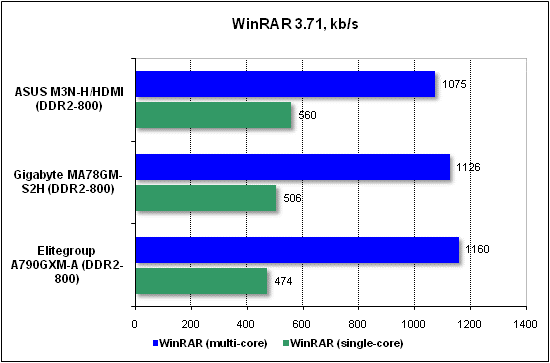 We compared the performance of ASUS M3N-H/HDMI versus motherboards based on AMD chipsets (Gigabyte MA78GM-S2H (780G) and Elitegroup A790GXM-A (790GX)).