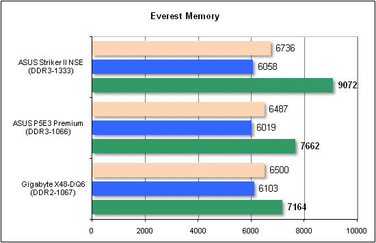 During the performance tests, we compared ASUS Striker II NSE versus ASUS P5E3 Premium (Intel X48) and Gigabyte X48-DQ6 (Intel X48).