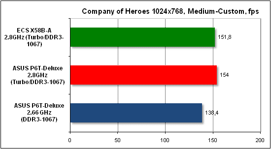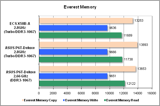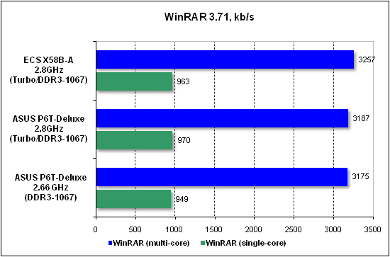 Now on to the practical overclocking. ECS X58B-A has demonstrated the following results: a stable operation at QPI = 180 MHz with a Bloomfield CPU. ![]() This result is not bad indeed. For comparison - we attained QPI=200 MHz with ASUS P6T-Deluxe, and QPI=212 MHz with ASUS Rampage II Extreme. In both cases, the multiplier of the memory controller had a nominal value. Performance testsWhen determining the starting FSB speed, it turned out that the board overstated it by merely 0.3 MHz. ![]() However, with the Turbo technology enabled, ECS X58B-A raised the multiplier by not 1 (as it should be as per Intel's specs) but a somehow higher value: ![]() ![]() But in running the tests (e.g. WinRAR), the board set the required multiplier (i.e. = 21). In any case, the mix-up with the multiplier does not give much credit to the test results. In our test setup, we used the following hardware: