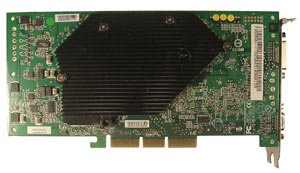 The video card offers a classical dark green PCB, 256 MB DDR onboard with a 256-bit data transmission bus (8 chips, 32 bit each, positioned over the front and rear sides of the PCB). The video card offers the AGP 2x/4x/8x interface and a standard set of outputs: one DVI-I, one analogous, and one TV-OUT.